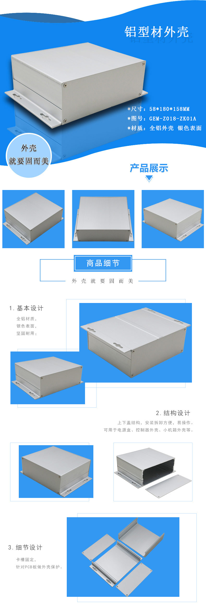 特點:1.全鋁材質(zhì),銀色表面,堅固耐用,卡槽固定,針對PCB板做外殼保護(hù)。